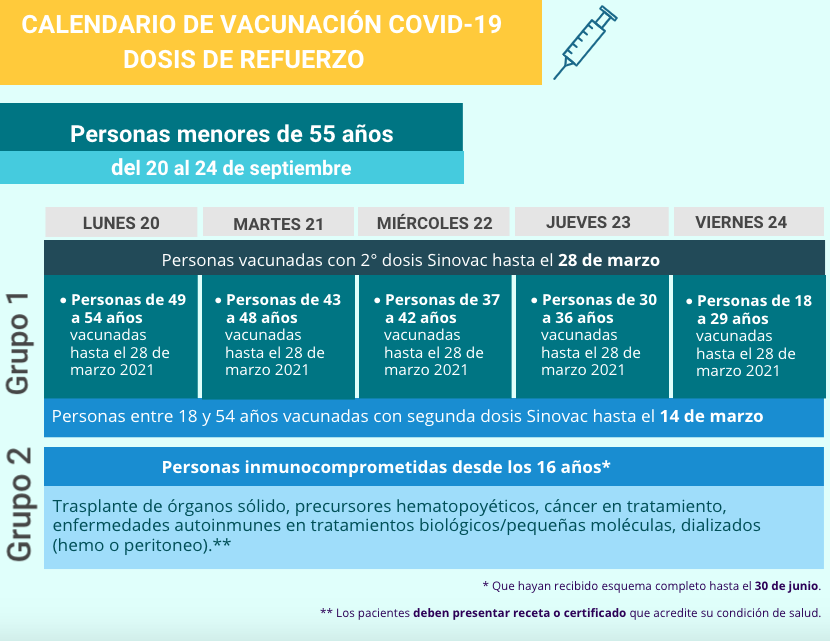 En ese sentido, desde este lunes 20 hasta el viernes 24 de septiembre, deben acudir a los diferentes centros de vacunación disponibles adolescentes, y mayores y menores de 55 años vacunados hasta el 28 de marzo para tener la dosis de refuerzo.