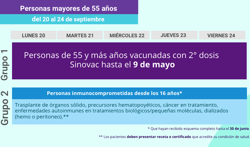 • Mayores de 55 años: Personas desde lo 55 años y más vacunadas con Sinovac hasta el 9 de mayo