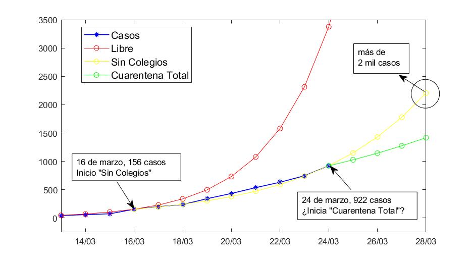 Este martes 24 de marzo, con 922 casos contabilizados, hay un nuevo quiebre proyectado. La línea verde apunta a lo que podría ocurrir si se implementara la cuarentena total. La amarilla que se proyecta hacia arriba apunta a lo que ocurrirá si no se adoptan nuevas medidas, más de 2 mil casos a fines de marzo. La proyección de ese y el actual escenario se observa en éste otro gráfico: