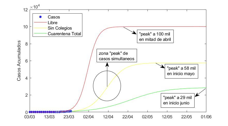 El quiebre ocurre el 16 de marzo, cuando parte la suspensión de clases. La curva, representada por la línea amarilla, varía a la baja en comparación al peor escenario, porque se extrae a un segmento de la población del potencial contagio.