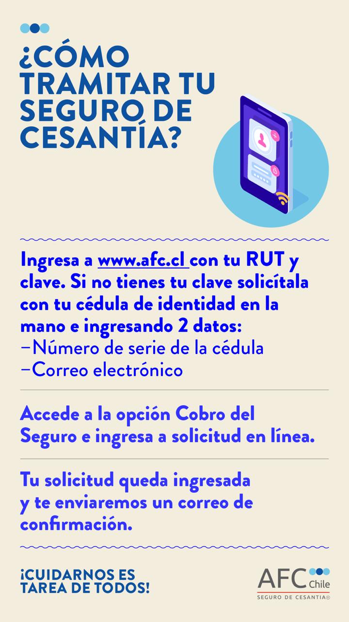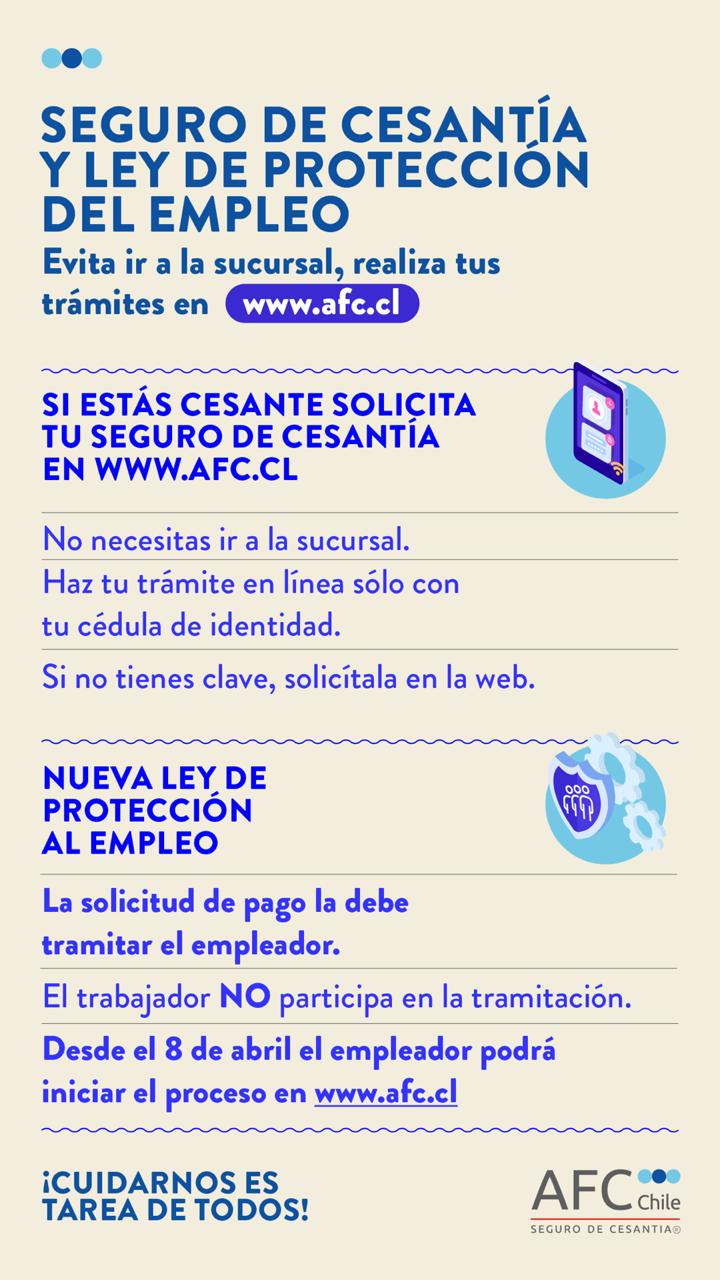 La Administradora de Fondos de Cesantía (AFC) ve con preocupación el hecho de que, de acuerdo a sus registros, solo el 30% de los afiliados que requieren tramitar su seguro de cesantía lo han hecho a través de www.afc.cl, lo que se ha traducido en enormes filas de personas que acuden presencialmente a las sucursales.