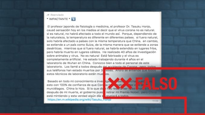 Son las famosas fake news, por su denominación en inglés. Por ejemplo, la reciente noticia de que el premio Nobel de Medicina 2018, Tasuku Honjo, aseguró que “el coronavirus fue fabricado por el hombre”. La falsa información se expandió tan rápido como la enfermedad por el mundo a través de redes sociales como WhatsApp, generando temor y acrecentando la incertidumbre en torno a la pandemia.
