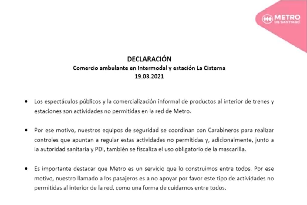 En tanto que desde la empresa de Metro declararon que los espectáculos públicos y el comercio ambulante al interior de sus dependencias "son actividades no permitidas".