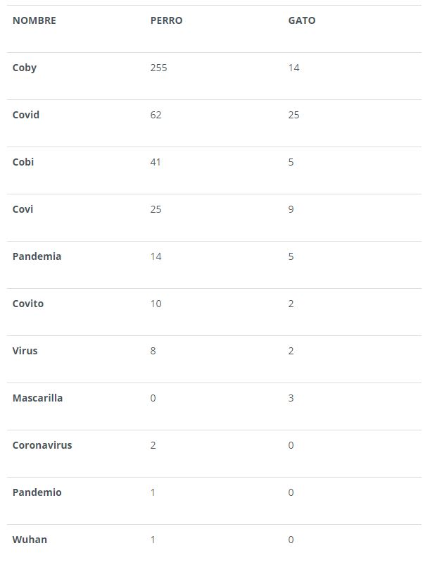 Como lo viene siendo en casi todas las áreas desde el 2020, la pandemia también dice presente, ya que cientos de personas se inspiraron en el virus para bautizar a sus peludos compañeros: se han inscrito 269 Coby, 87 Covid, 12 Covito, un Pandemio y un Wuhan.