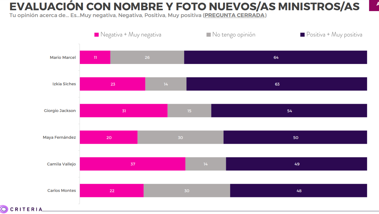 En cuanto al gabinete, el sondeo colocó al futuro titular de Hacienda, Mario Marcel, como el mejor ministro mejor evaluado por los consultados, ya que alcanzó un 64% de “opinión positiva”