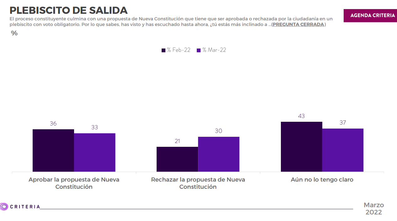 En el caso de esta última, tuvo un aumento de nueve puntos en solamente un mes (21% a 30%). En tanto, la opción Apruebo tuvo una disminución de tres puntos (36% a 33%).