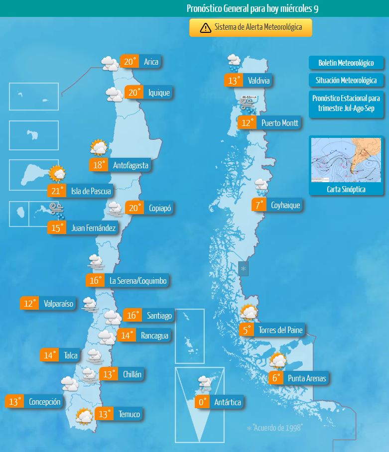 Hacia el sur, las temperaturas siguen a la baja, con 13° en Concepción, Temuco y Valdivia. MeteoChile