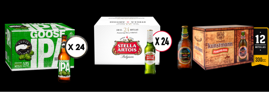 Destacamos este pack de 24 botellas de cerveza Stella Artois a $9.990, la valdiviana Kunstmann Torobayo 12 botellas por $8.990 y la norteamericana Goose Island en su variedad IPA 24 botellas por $19.990.
