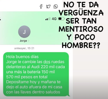 Son $570 mil en total. Deposítame hoy y mañana. Te dejo el auto afuera de mi casa con las llaves adentro. Saludos", escribió la influencer.