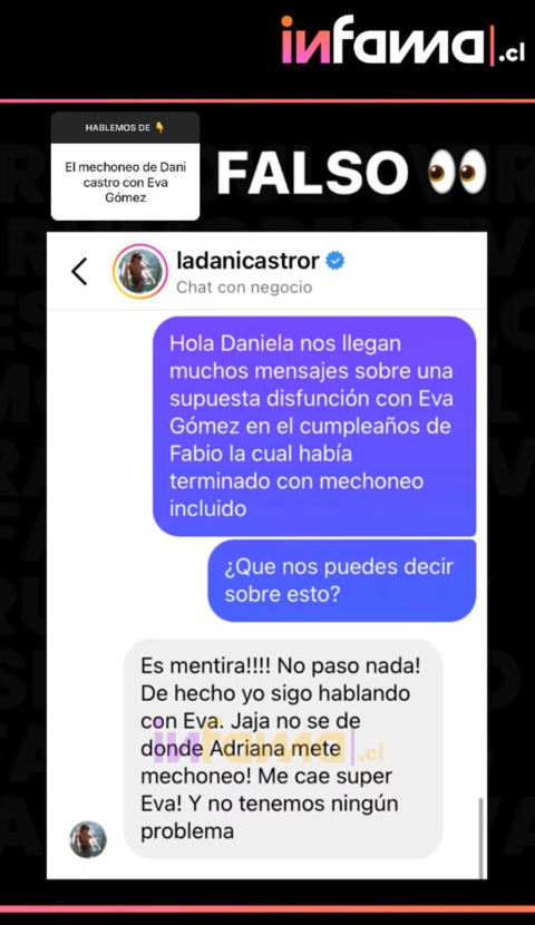 Una vez que la polémica salió a la luz, Daniela Castro rompió el silencio sobre las acusaciones que hizo la modelo en su contra y se refirió a la supuesta rivalidad que tendría con Eva Gómez.  La ganadora de MasterChef fue consultada por lo ocurrido a través de un mensaje que le envió en portal Infama, donde negó rotundamente los hechos que relató Adriana Barrientos y aseguró que mantiene una buena relación con la comunicadora.  ¡Es mentira! ¡No pasó nada! De hecho, yo sigo hablando con Eva. Jaja no sé de dónde Adriana mete mechoneo. ¡Me cae super, Eva! Y no tenemos ningún problema”, expresó.