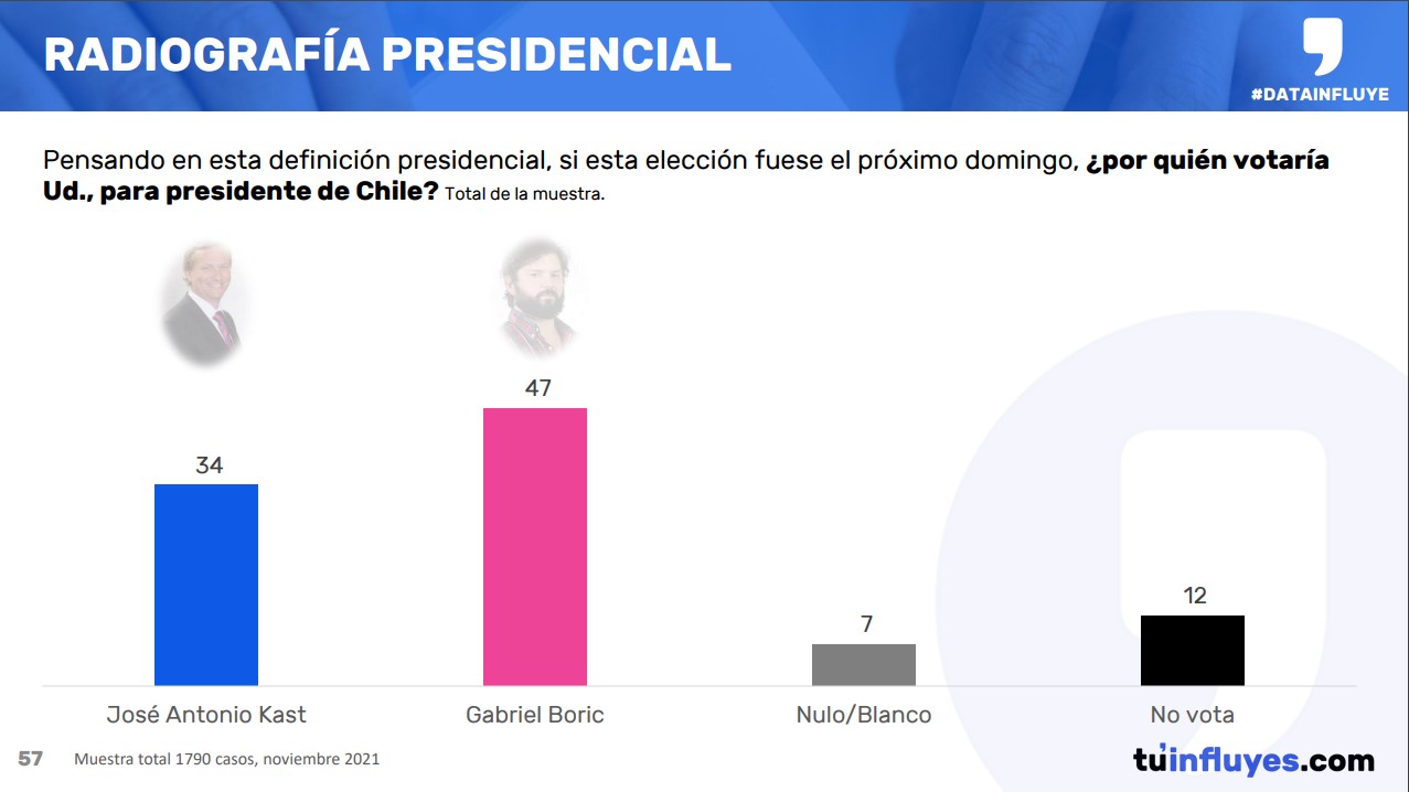 Al igual que Cadem y Pulso Ciudadano, la última encuesta Data Influye reveló que el candidato presidencial de Apruebo Dignidad, Gabriel Boric, ganaría la segunda vuelta a realizarse el próximo 19 de diciembre.
