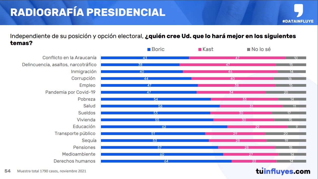 Por su parte, el diputado se posiciona por sobre el ex UDI en temas como corrupción (44%), empleo (47%), pandemia (47%), pobreza (54%), salud (58%), sueldos (53%), vivienda (55%), educación (62%), transporte público (51%), sequía (53%), pensiones (57%), medioambiente (60%) y derechos humanos (64%).