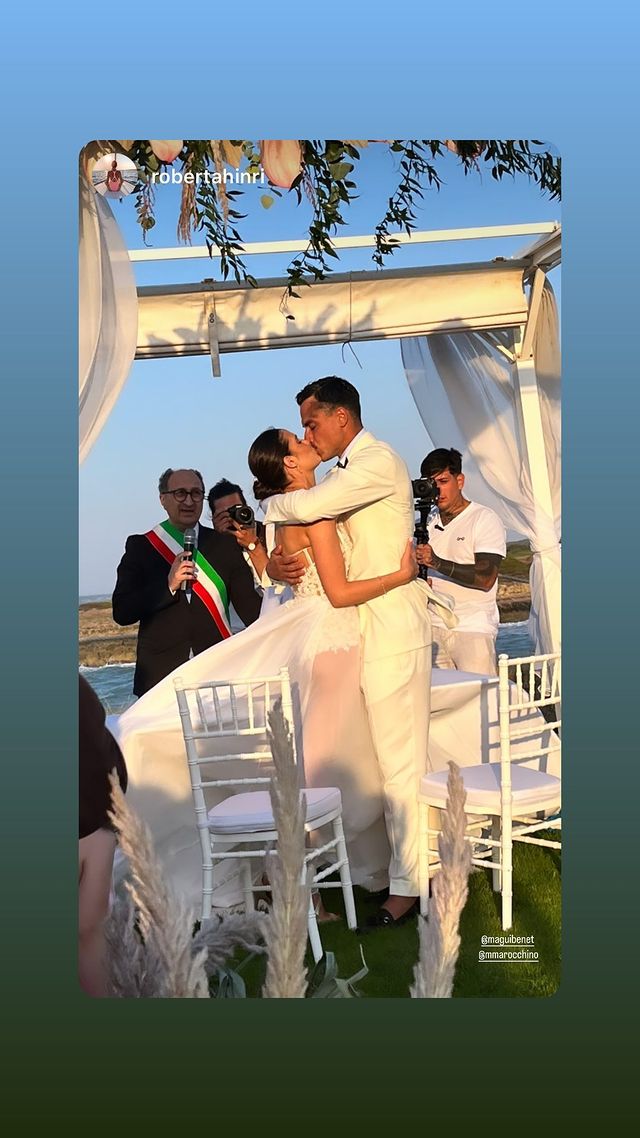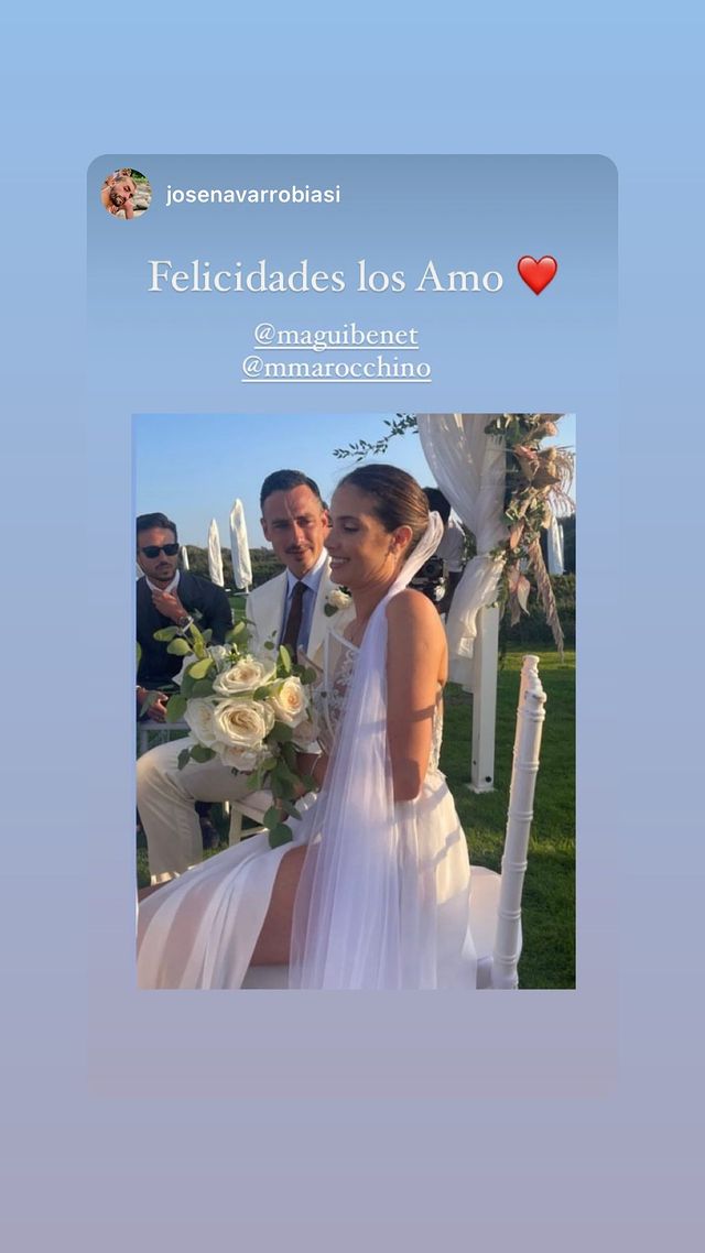 Asistentes a la cita como Valentín Benet y Marco Ferri compartieron historias del momento en que la pareja dio el sí a orillas del mar. Según las imágenes, ella lució un vestido blanco de encaje y él del mismo color, pero con una corbata burdeo.