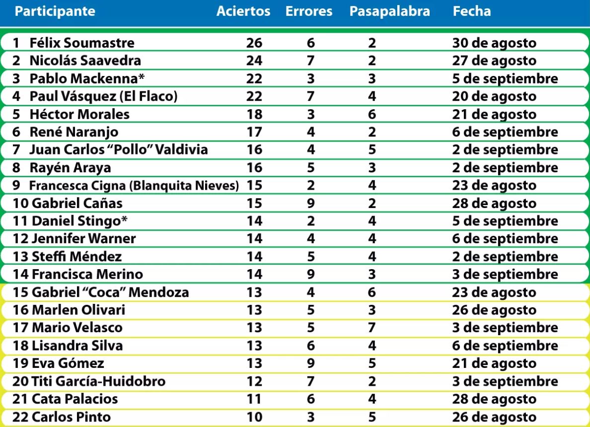Según este ranking, el famoso con mejor desempeño fue el ex chico reality Félix Soumastre (26 aciertos), seguido de Nicolás Saavedra (24 aciertos), Pablo Mackenna (22 aciertos) y Paul Vásquez (22 aciertos).