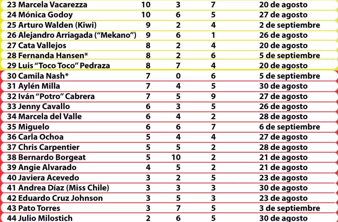 Al otro extremo de la tabla estuvieron: el actor Julio Milostich (2 aciertos), seguido de Patricio Torres (3 aciertos), Eduardo Cruz-Johnson (3), Andrea Díaz (3) y Javiera Acevedo (3).