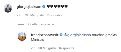 El titular de la Segpres escribió una serie de corazones en la publicación, mientras que Pancho le respondió "muchas gracias, ministro". Lo mismo hizo el diputado Marcelo Díaz.