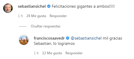 Sebastián Sichel, en tanto, expresó "felicitaciones gigantes a ambos!!!!!" y el rostro de Canal 13 le comentó "mil gracias Sebastián, lo logramos".