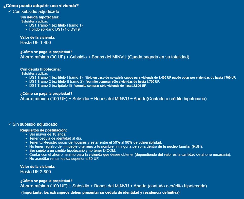Uno de los requisitos básicos para postular a las viviendas es contar con el subsidio de Integración Social y Territorial, DS19, el cual "permite a familias de diferentes realidades socioeconómicas que buscan adquirir su primera vivienda con apoyo del Estado, acceder a proyectos habitacionales en barrios bien localizados y cercanos a servicios, con estándares de calidad en diseño, equipamiento y áreas verdes", indica la página web del Minvu.