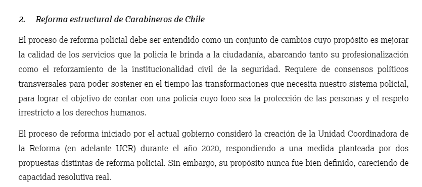 No obstante, desde su sitio web la información fue actualizada: "Reforma estructural de Carabineros de Chile: El proceso de reforma policial debe ser entendido como un conjunto de cambios cuyo propósito es mejorar la calidad de los servicios que la policía le brinda a la ciudadanía, abarcando tanto su profesionalización como el reforzamiento de la institucionalidad civil de la seguridad".