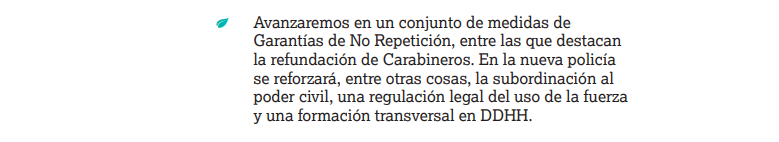 Sin embargo, hasta este 8 de diciembre la idea de refundar las policías sigue plasmada en el programa del abanderado presidencial. "Avanzaremos en un conjunto de medidas de Garantías de No Repetición, entre las que destacan la refundación de Carabineros. En la nueva policía se reforzará, entre otras cosas, la subordinación al poder civil, una regulación legal del uso de la fuerza y una formación transversal en DDHH", se lee en el documento.
