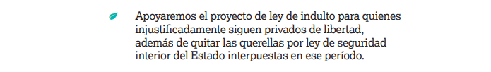 Lee también: Boric ratifica dichos por indulto a presos del 18-O: "Quienes están condenados tienen que hacerse cargo"Sobre este tema, en su programa de gobierno el candidato presidencial profundizó: "Apoyaremos el proyecto de ley de indulto para quienes injustificadamente siguen privados de libertad, además de quitar las querellas por ley de seguridad interior del Estado interpuestas en ese período".