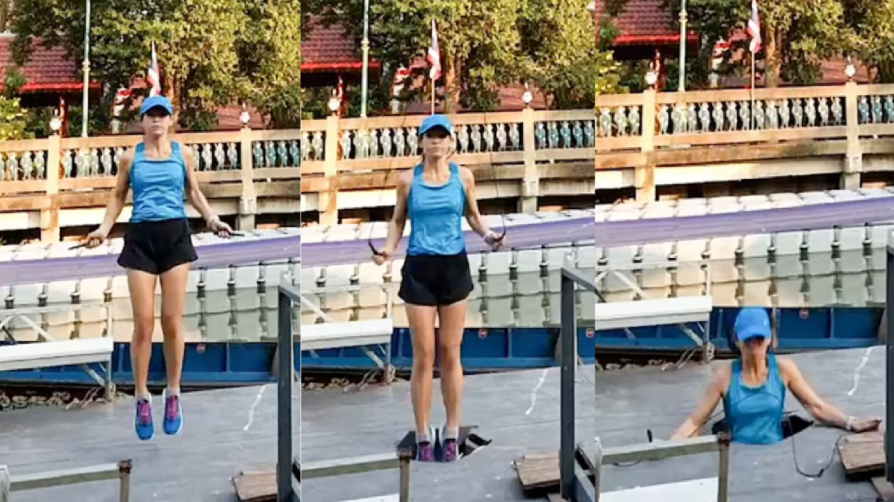Un insólita caída le ocurrió a una mujer que hacía ejercicio en Tailandia, quien saltaba la cuerda sobre un embarcadero de un río cuando éste se rompió y causó que cayera por un agujero.