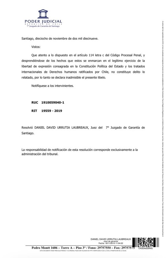 Sobre la querella, el juez Daniel Urrutia determinó que "desprendiéndose de los hechos que estos se enmarcan en el legítimo ejercicio de la libertad de expresión consagrada en la Constitución Política del Estado y los tratados internacionales de derechos humanos ratificados por Chile, no constituye delito lo relatado".
