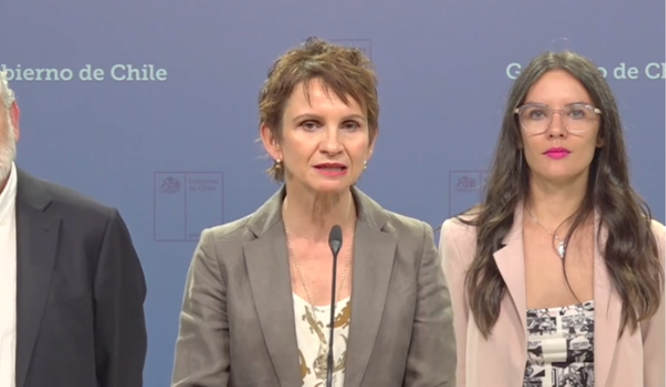 Carolina Tohá, desde un punto de prensa en La Moneda junto a otras autoridades como el titular de Vivienda y Urbanismo,