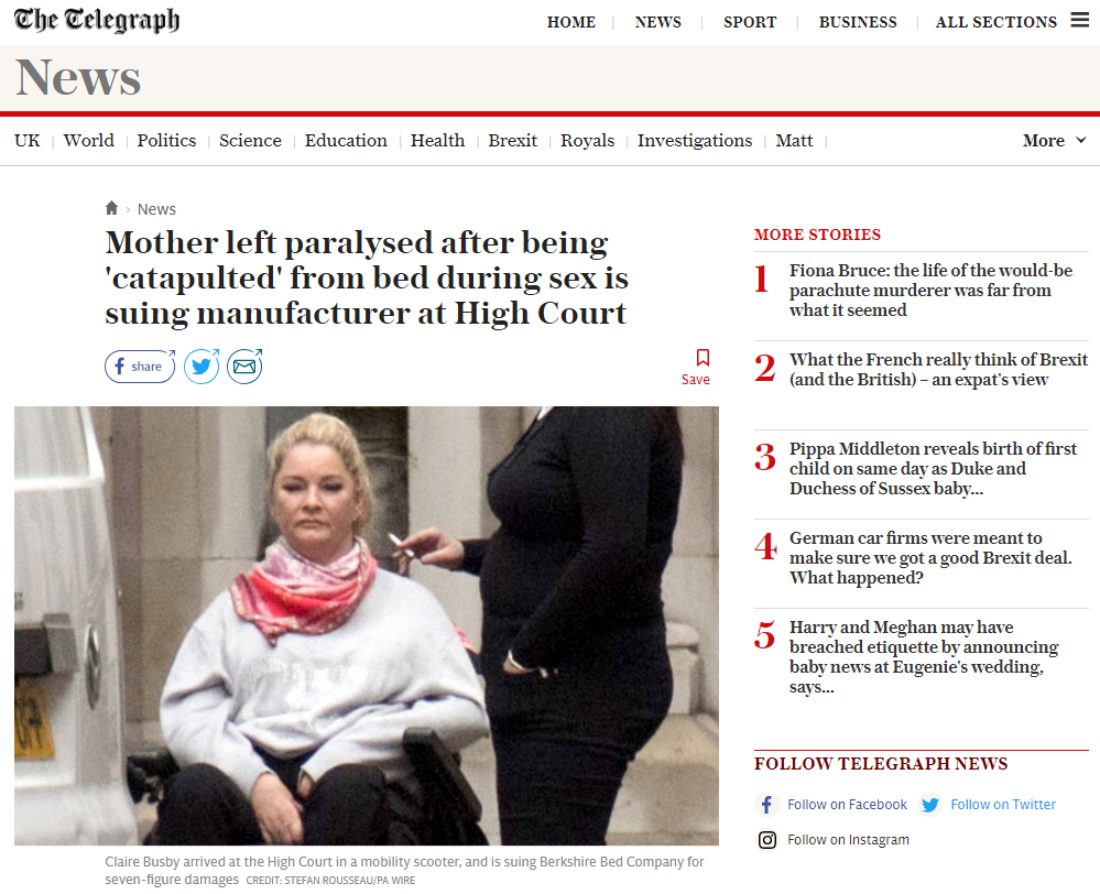El accidente ocurrió en 2013, cuando, la mujer, identificada como Claire Busby (46), se encontraba manteniendo relaciones sexuales sobre la cama recién adquirida, momento en que se desató la tragedia.Claire Busby, of Maidenhead. https://t.co/x4hK7LdC3Q— Tom Ferguson (@ferguson_twf) October 15, 2018