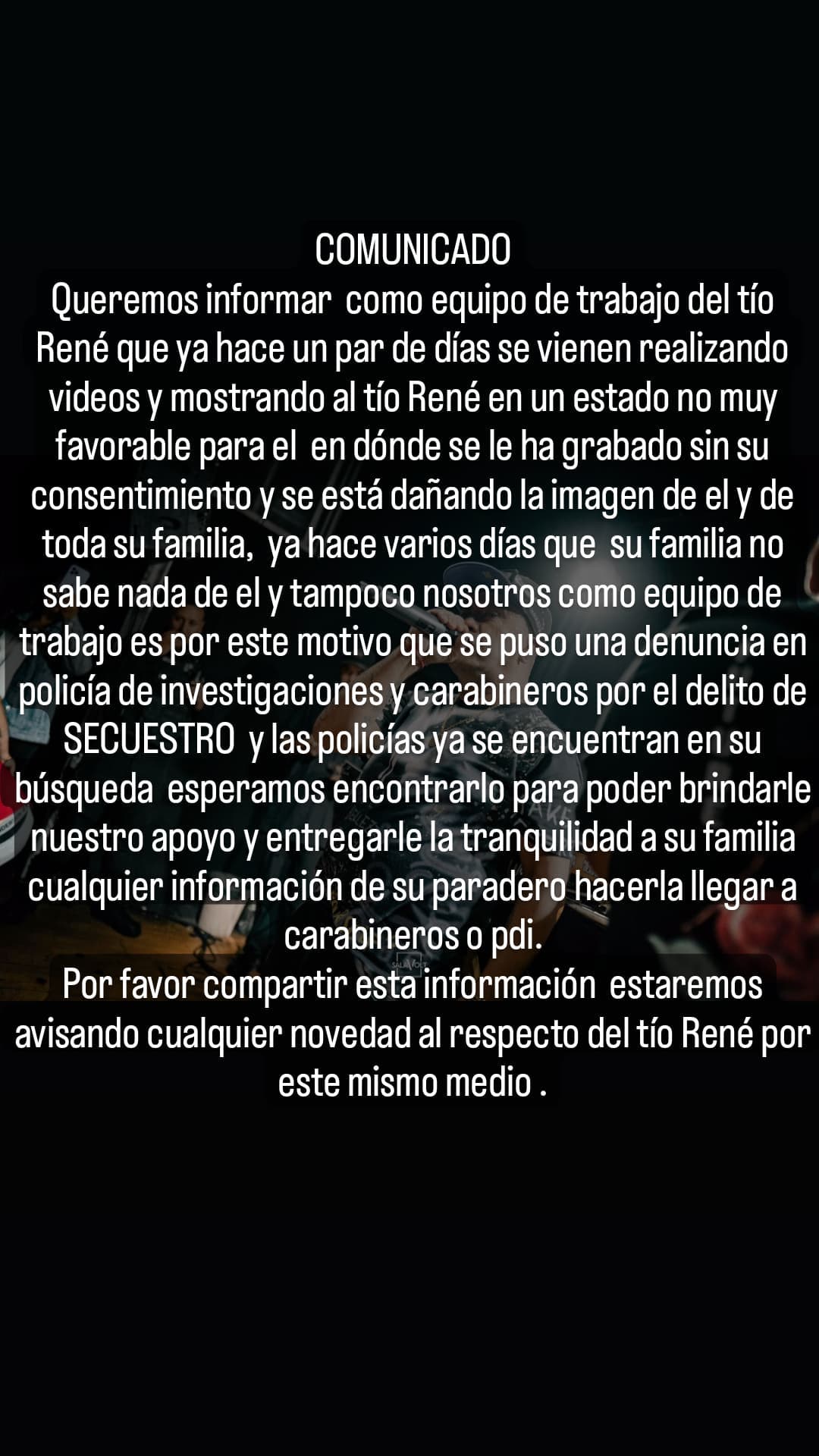 "Se le ha grabado sin su consentimiento y se está dañando la imagen de él y de toda su familia", añadieron en la declaración, donde su familia "ya hace varios días que no sabe nada de él". Debido a eso, informaron que denunciaron el hecho ante la Policía de Investigaciones (PDI) y Carabineros por el delito de secuestro: "Las policías ya se encuentran en su búsqueda". "Esperamos encontrarlo para poder brindarle nuestro apoyo y entregarle la tranquilidad a su familia", escribieron en la red social. En esa línea, dijeron que cualquier información de su paradero se puede hacer llegar a Carabineros o la PDI.Ver esta publicación en Instagram