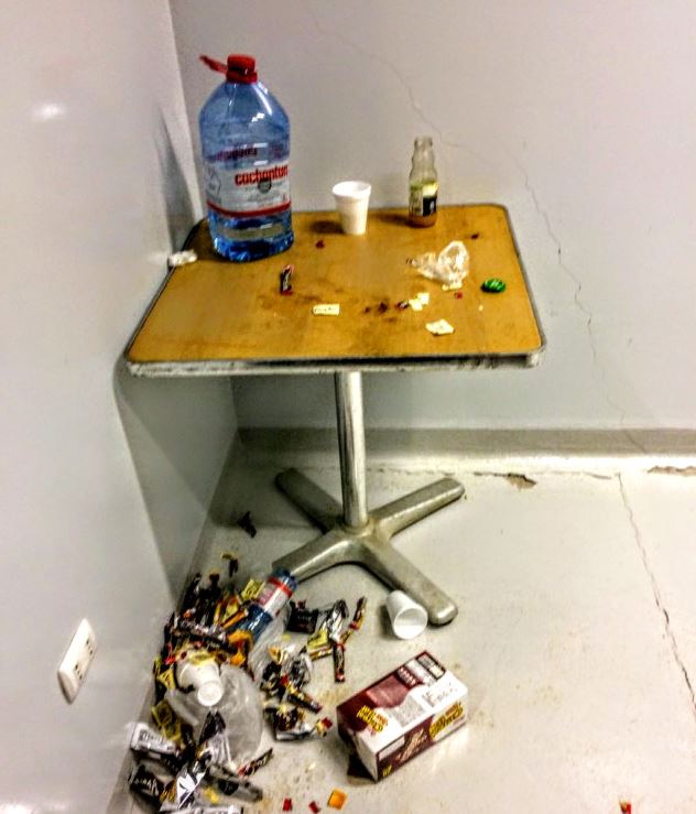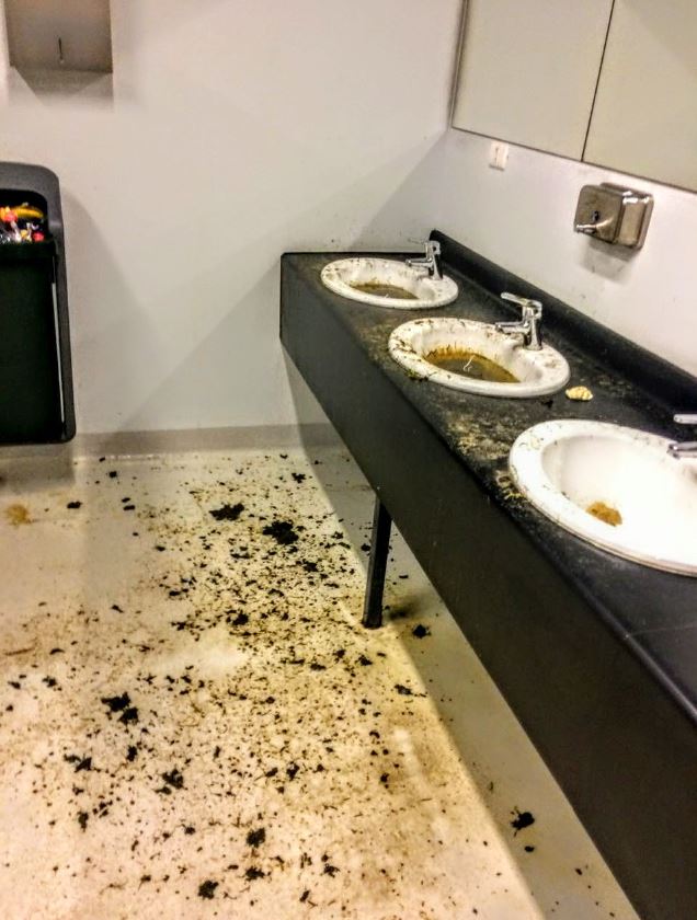 En las fotos se ven lavamanos tapados, con aguas sucias y desperdicios en el suelo, además de basura acumulada en las esquinas donde se aprecian envases de barritas de cereal y botellas de agua desgacificada.