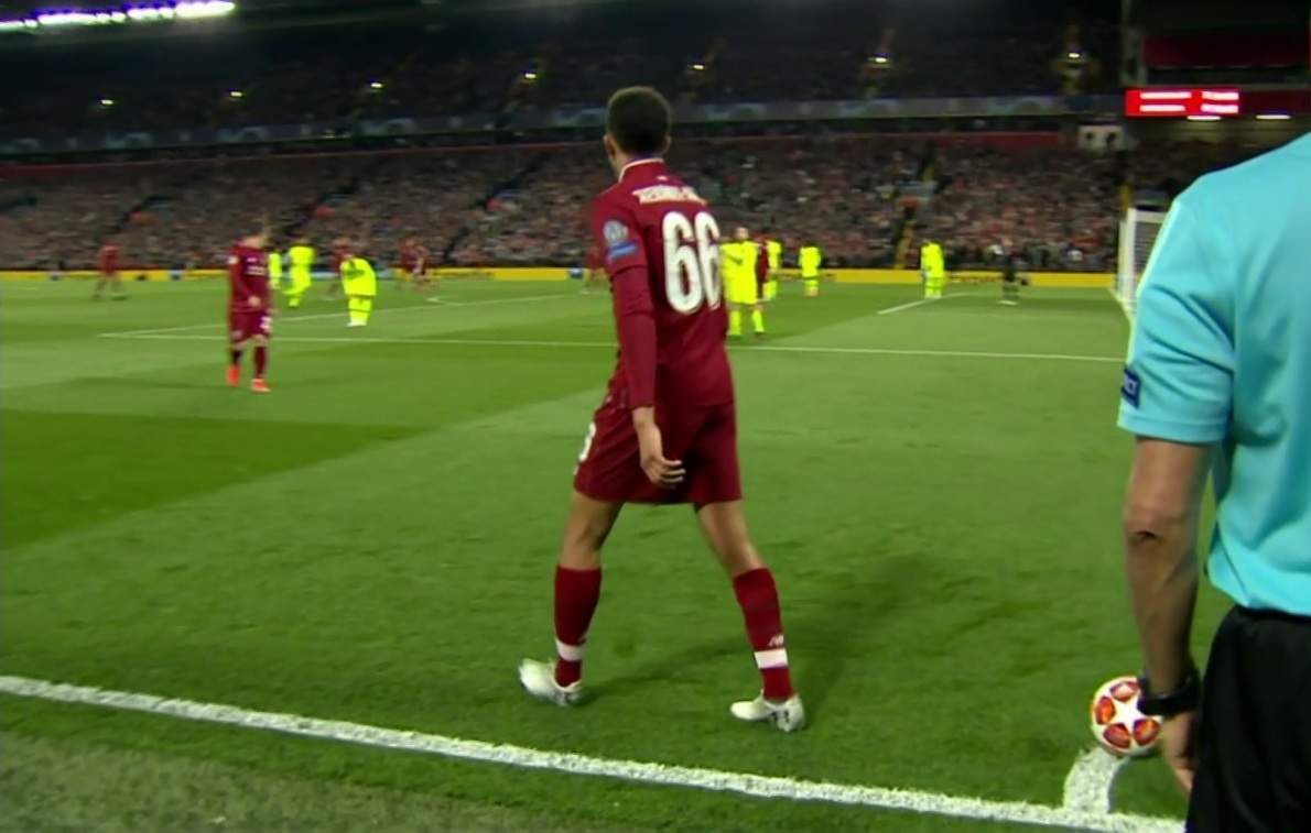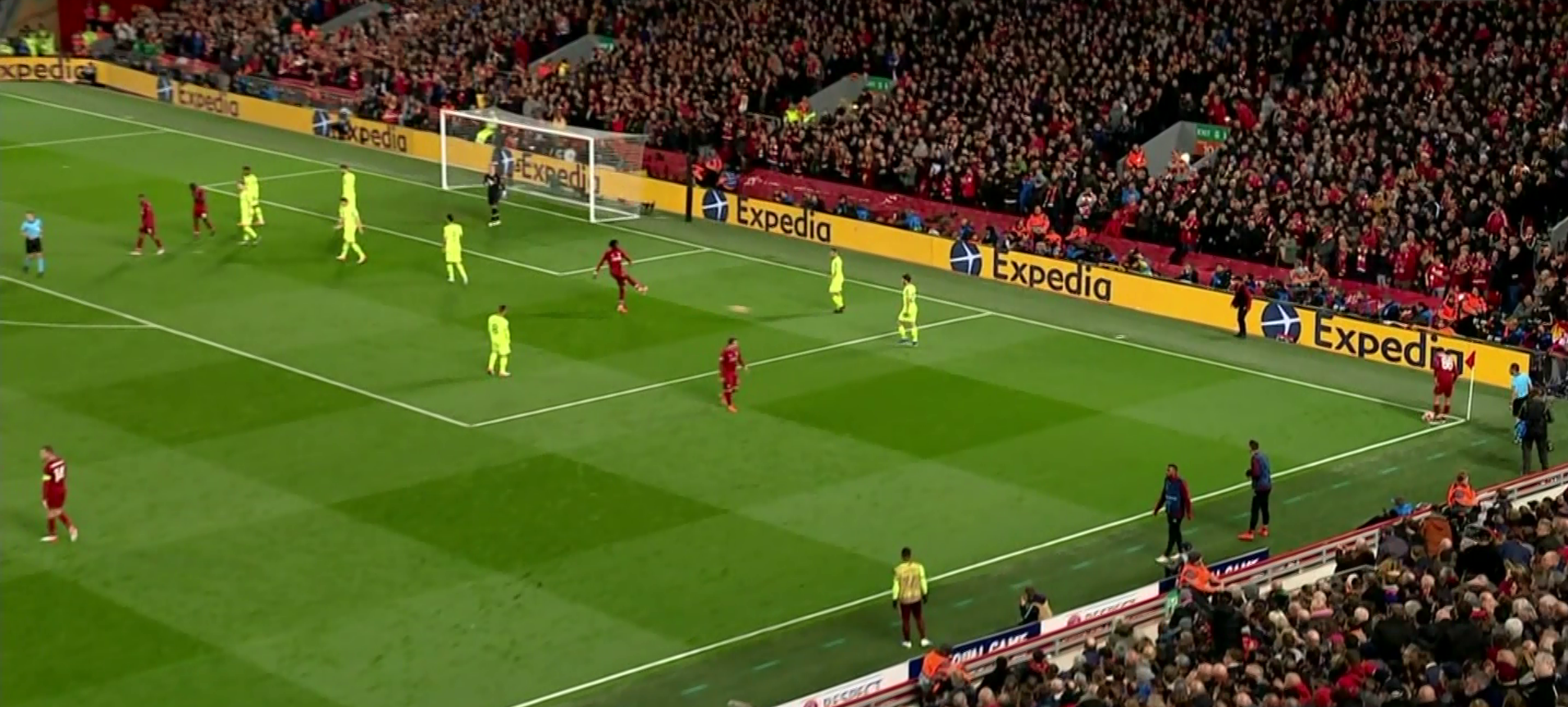 Posiciona Alexander-Arnold, pero Shaqiri le dice que pare. Él va. Hay tiempo para planear la jugada y retomar posiciones. Los atacantes en el área incluso se resienten por el cansancio.