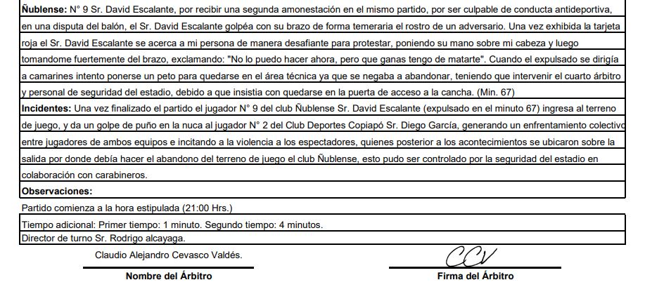 Esto es parte del informe de Claudio Cevasco, árbitro del duelo entre Deportes Copiapó contra Ñublense. Escalante fue expulsado, protestó la decisión del juez y una vez que terminó el partido golpeó por la espalda a un rival (Diego García) desatando un enfrentamiento entre los jugadores de ambos equipos.