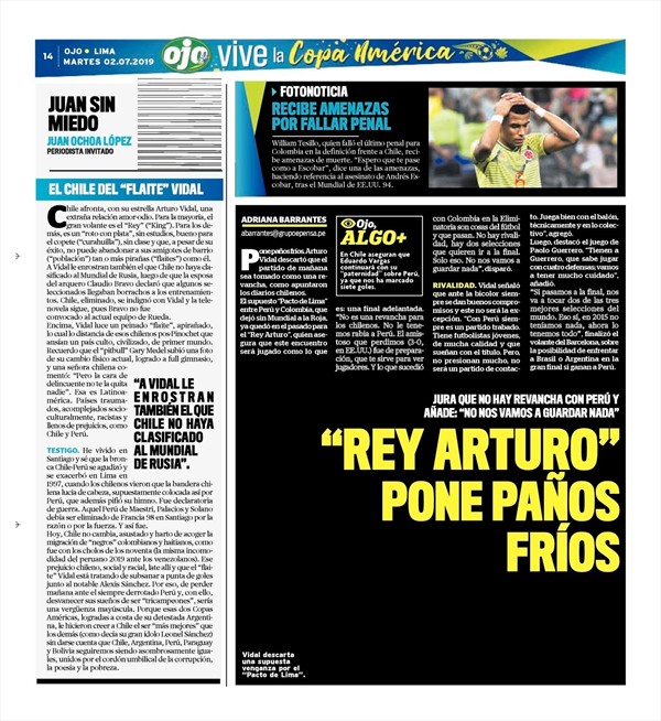 Lo de siempre, como siempre. En la previa del duelo entre Chile y Perú por las semifinales de la Copa América 2019 -miércoles 3 de julio, 20:30 horas-, la prensa peruana calentó este partido atacando a Arturo Vidal en una columna que publicó el periodista Juan Ochoa López en el diario El Ojo, titulada el "El Chile del Flaite Vidal".