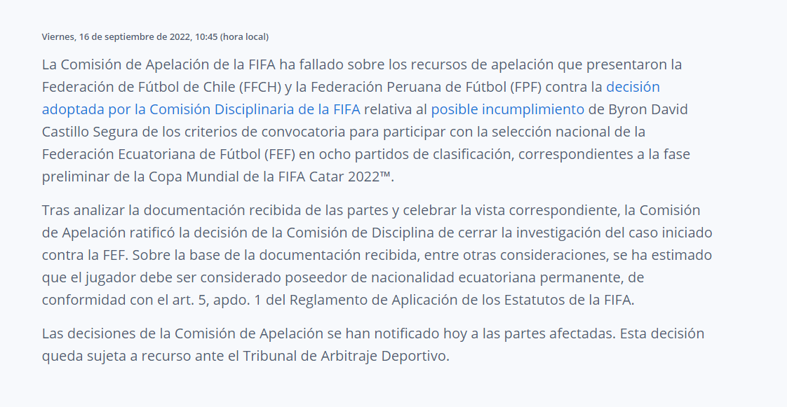 Este viernes, la Comisión de Apelaciones de la FIFA dio a conocer su decisión sobre el caso del jugador ecuatoriano, Byron Castillo, ante la denuncia de la Federación de Fútbol Chileno -y también de Perú-, que acusaban que el jugador supuestamente no tenía su nacionalidad regularizada para disputar los partidos de la Clasificatorias al Mundial de Qatar 2022.