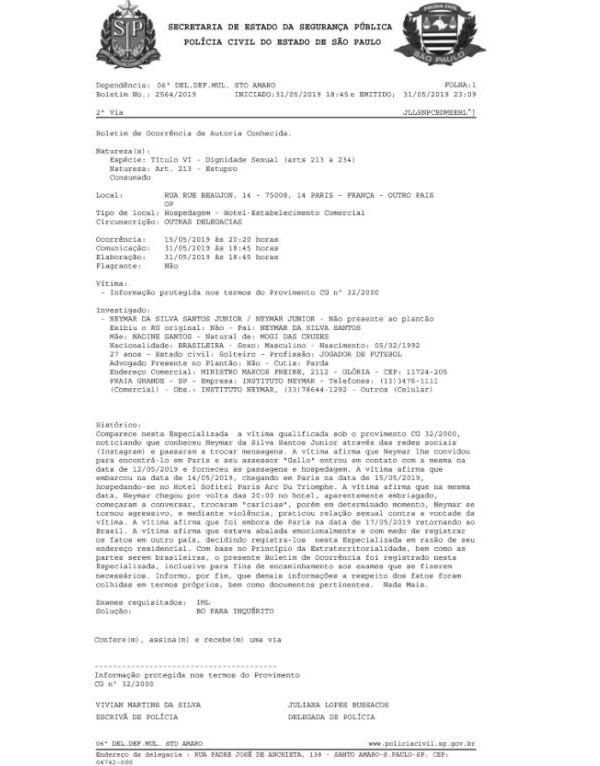 “Comenzaron a conversar, intercambiaron ‘caricias’, pero en un determinado momento, Neymar se volvió agresivo, y mediante violencia, practicó relación sexual contra la voluntad de la víctima. La víctima afirma que se fue de París en la fecha de 17/05/2019 volviendo a Brasil”, dice un extracto de la denuncia divulgada.