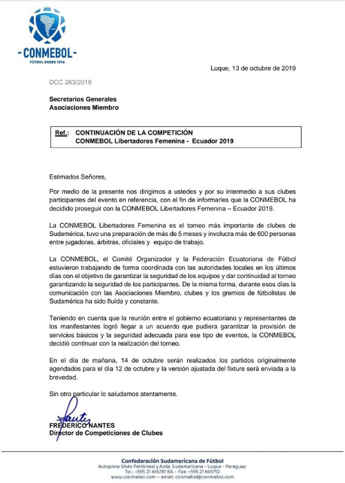 La Conmebol informó de la nueva programación del certamen tras la pausa por la situación político social que atraviesa Ecuador.