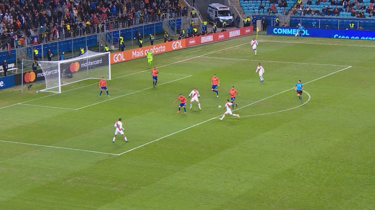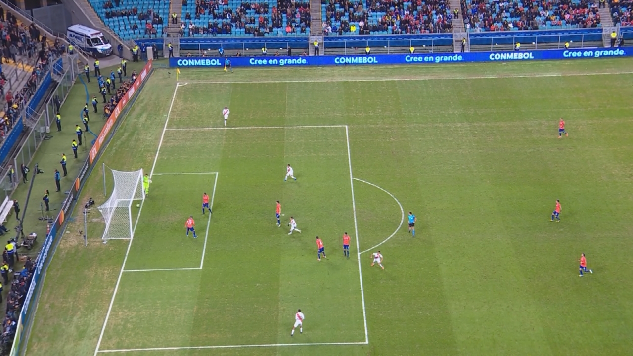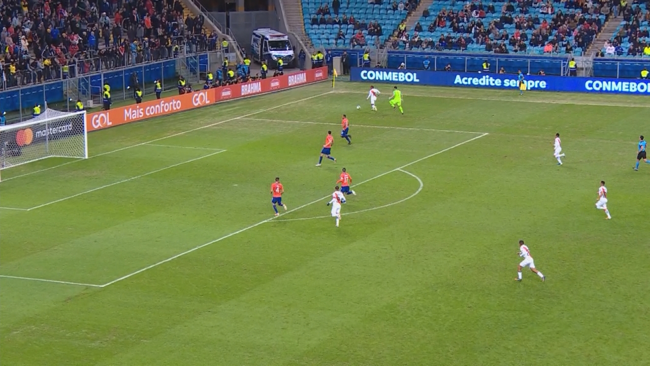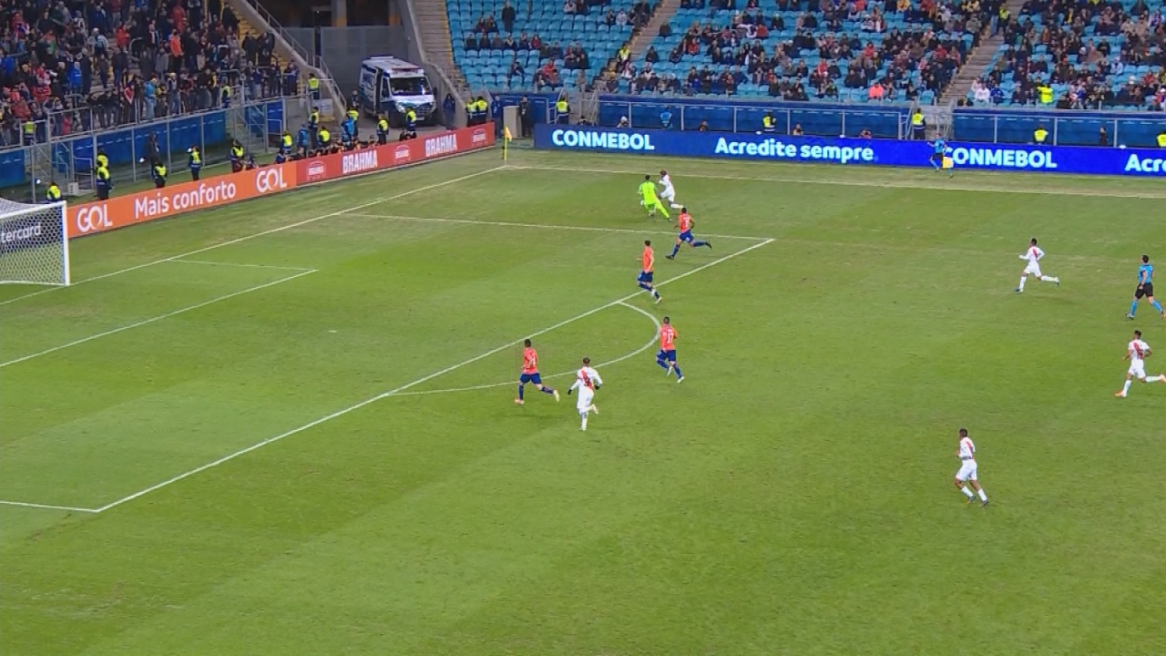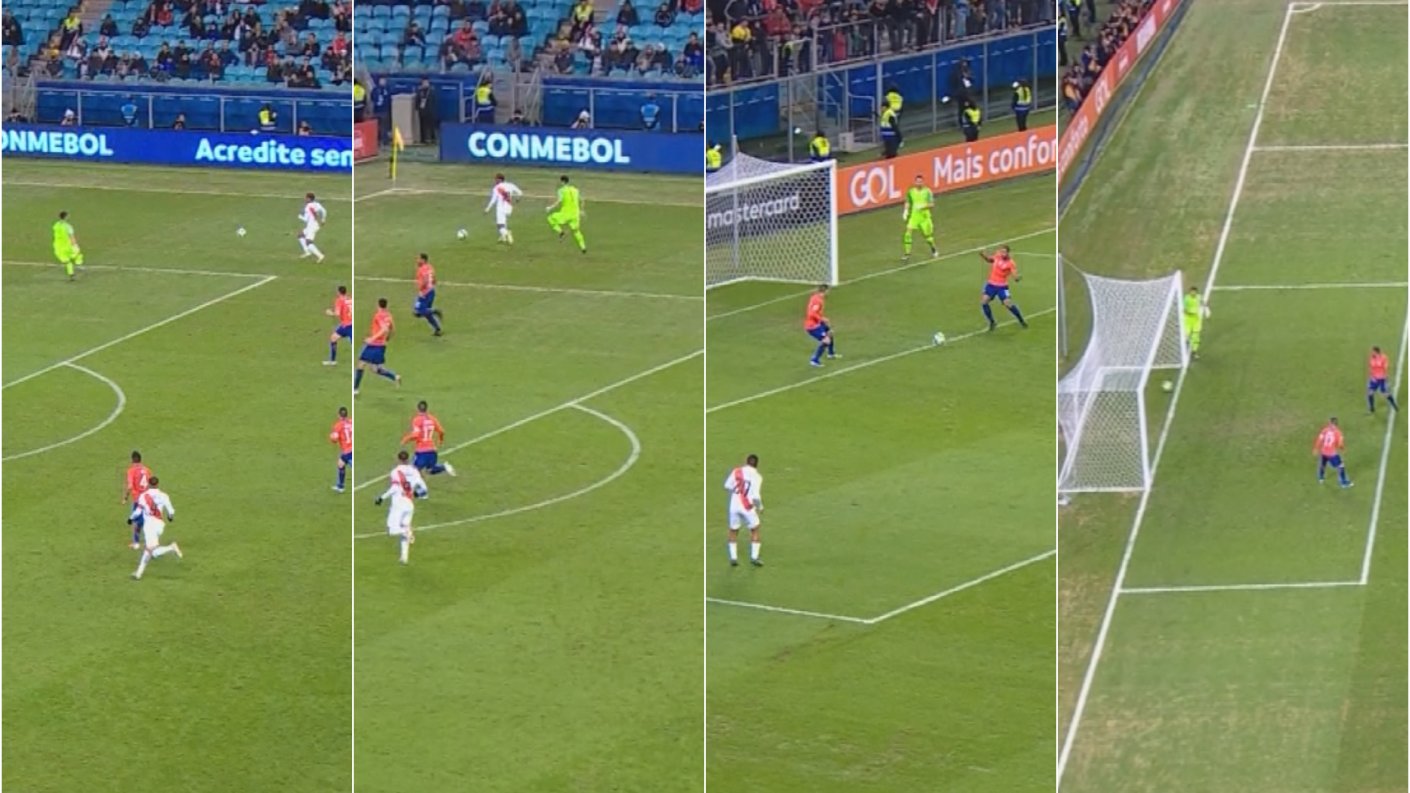 Chile iba sólo 1-0 abajo en el marcador cuando a 8' del final del primer tiempo un zapatazo desde el campo de Perú cruzó todo el medio campo y pilló mal parada a la defensa de la Roja.