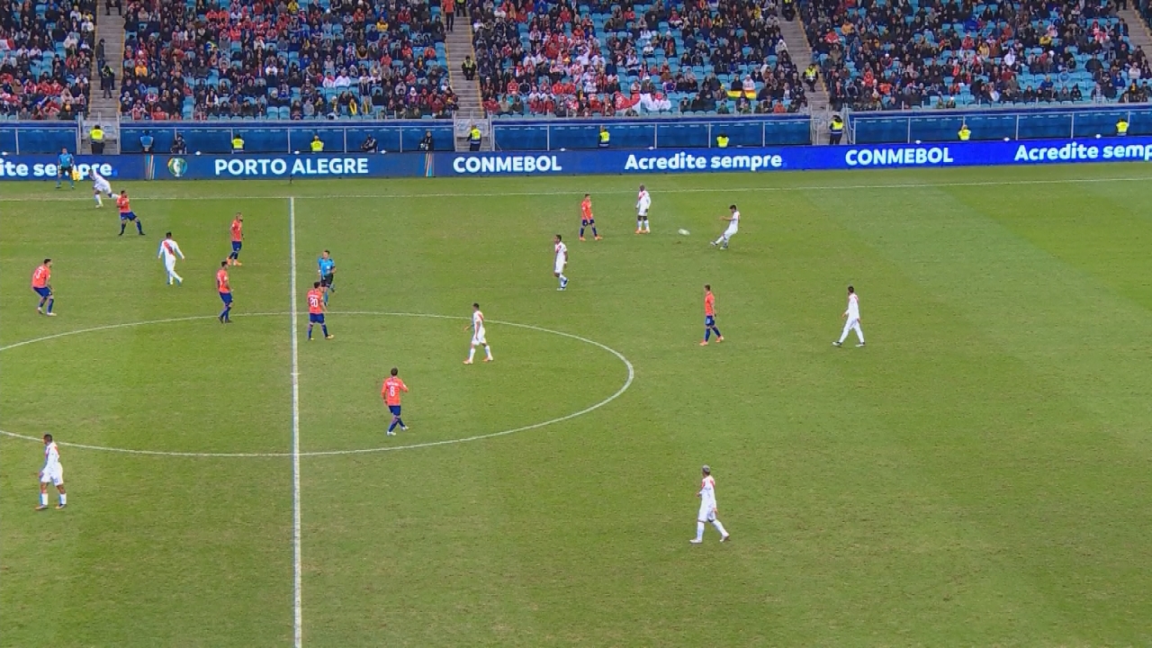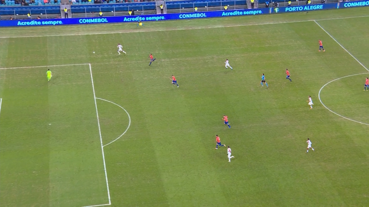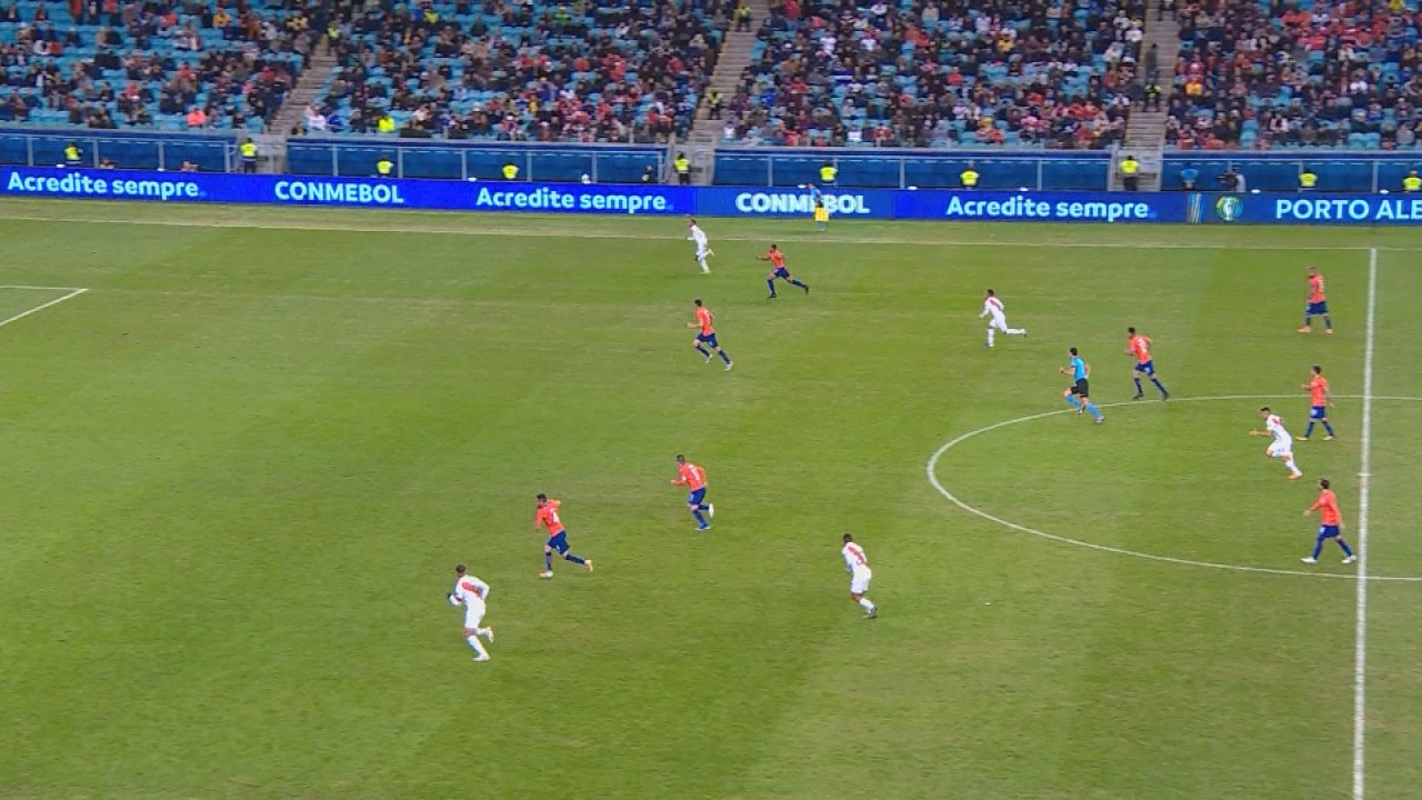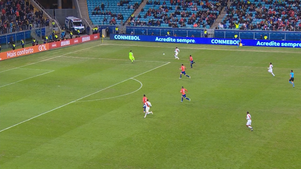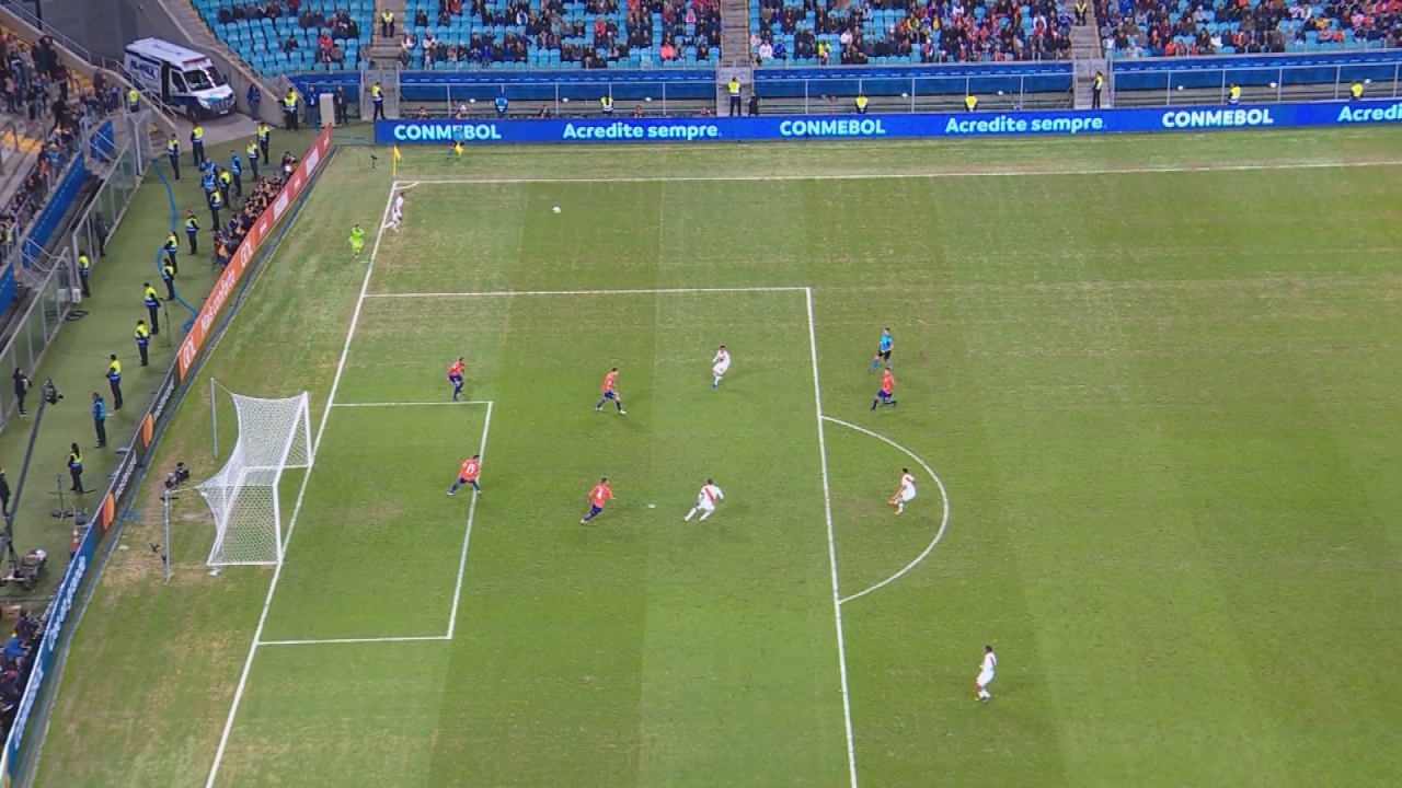 Chile iba sólo 1-0 abajo en el marcador cuando a 8' del final del primer tiempo un zapatazo desde el campo de Perú cruzó todo el medio campo y pilló mal parada a la defensa de la Roja.