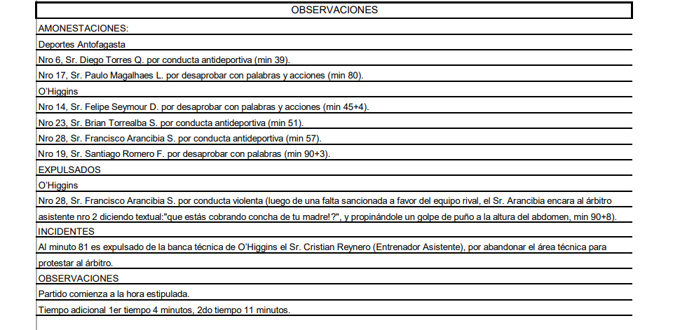 Una vez terminado el cotejo, el árbitro en su informe describió la situación, luego que Francisco Arancibia fuera expulsado en el epílogo. “Sr. Francisco Arancibia S. por conducta violenta (luego de una falta sancionada a favor del equipo rival, el Sr. Arancibia encara al árbitro asistente número 2 diciendo textual: “¿qué estás cobrando concha de tu madre!?”, y propinándole un golpe de puño a la altura del abdomen”, se lee en el documento.