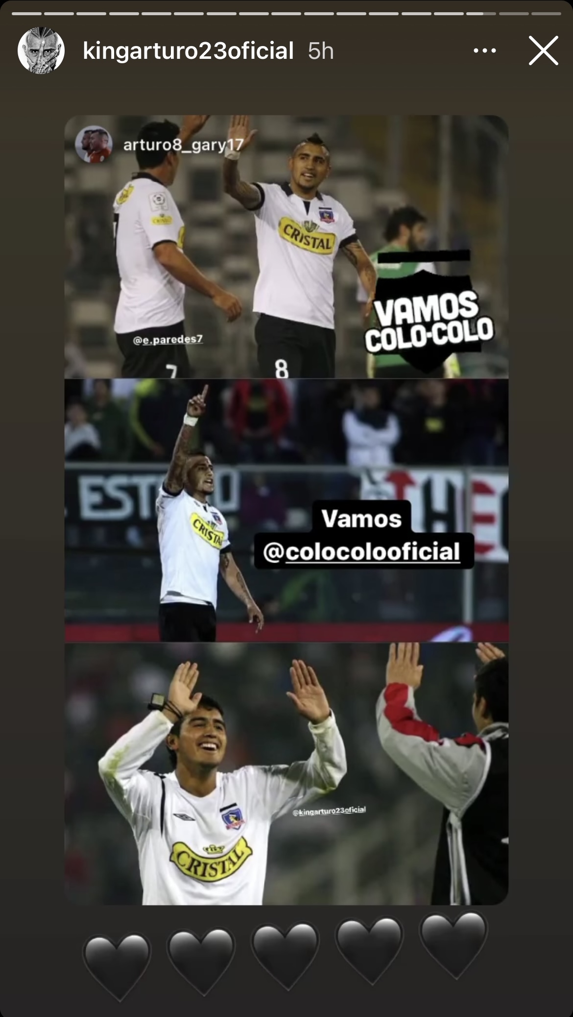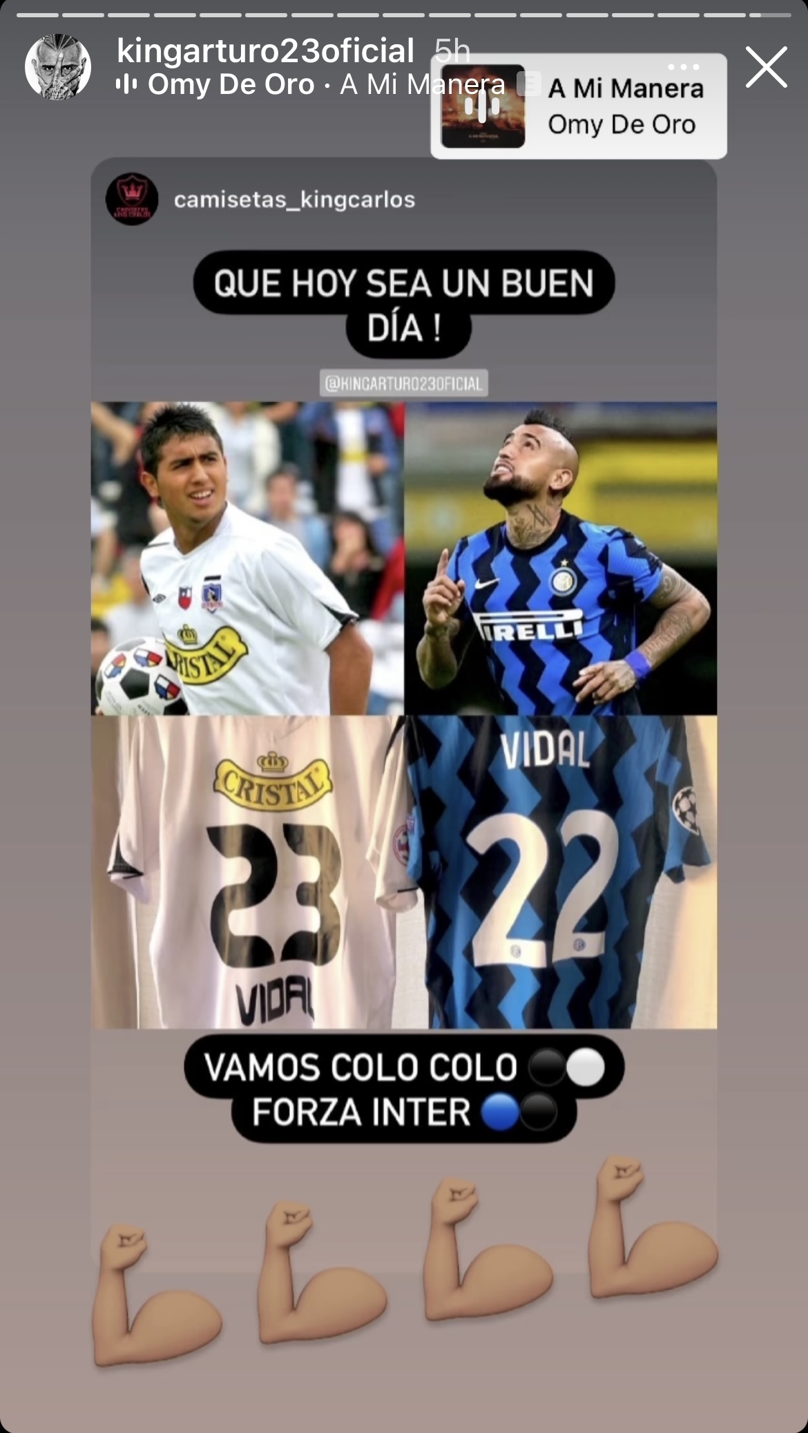 Además, en la previa del clásico italiano entre el Inter de Milán y la Juventus, el "King" aprovechó de compartir imágenes con la camiseta de Colo Colo en su cuenta de Instagram.