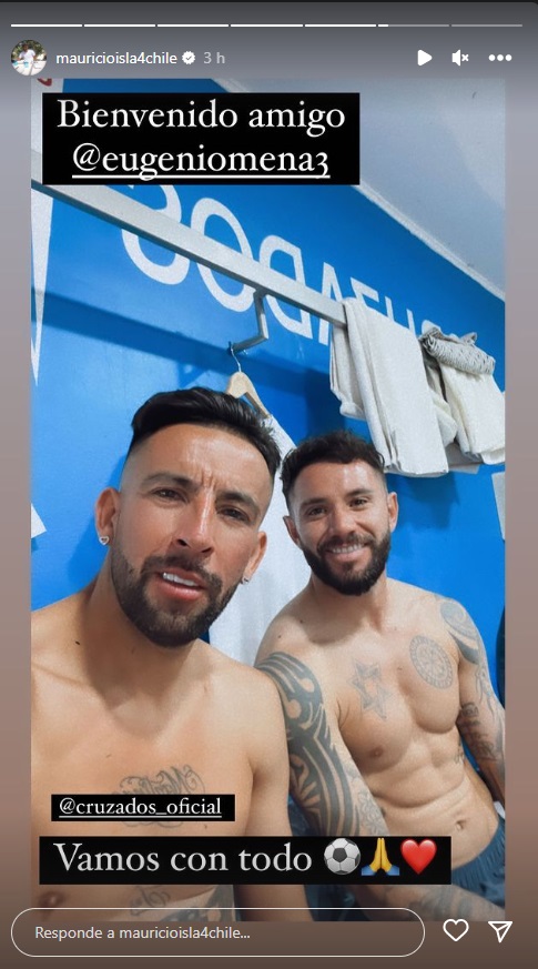 "Bienvenido amigo. Vamos con todo", escribió el Huaso en una historia subida a su Instagram, agregando una selfie tomada en uno de los camarines de San Carlos de Apoquindo en el que posan con el torso desnudo.