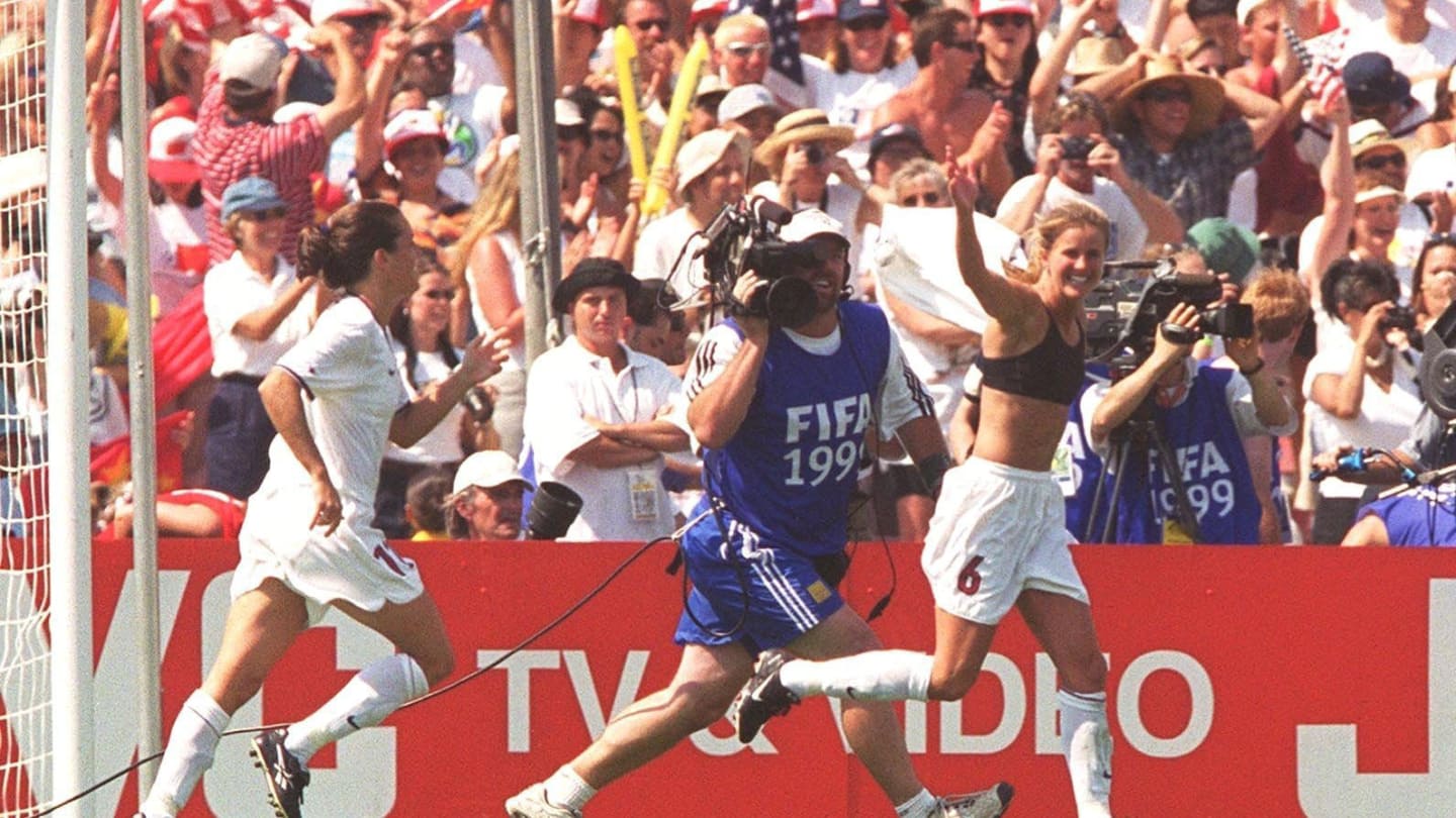 La siguiente edición, en 1999, se desarrolló en Estados Unidos. Este fue el primer título para las locales, quienes se llevaron la copa tras un durísimo empate 0-0 frente a China que se dirimió en penales. Ahí, la USWNT derrotó por 5-4 a las asiáticas y dio la vuelta olímpica en el Rose Bowl de Pasadena, California.