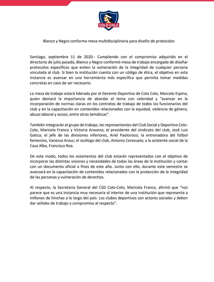 El gerente deportivo de Colo Colo, Marcelo Espina, destacó que es importante avanzar en la "capacitación en contenidos relacionados con equidad, violencia de género, abuso laboral y acoso". Se espera poder contar con un documento para fines del 2020.