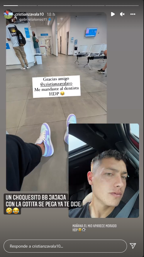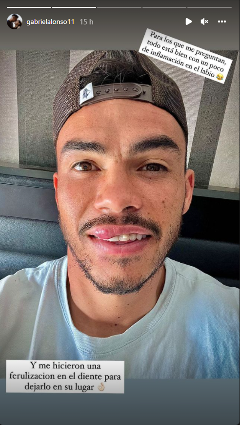 “Para los que me preguntan, todo está bien. Con un poco de inflamación en el labio. Me hicieron una ferulización en el diente para dejarlo bien”, contó el seleccionado nacional en una historia de Instagram.