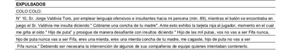 Lee también: Valdivia no se controló y le dijo de todo a Hermosilla tras ser expulsadoLo anterior, luego de que el juez entregara los detalles de las palabras del volante expulsado a los 88' en el documento.