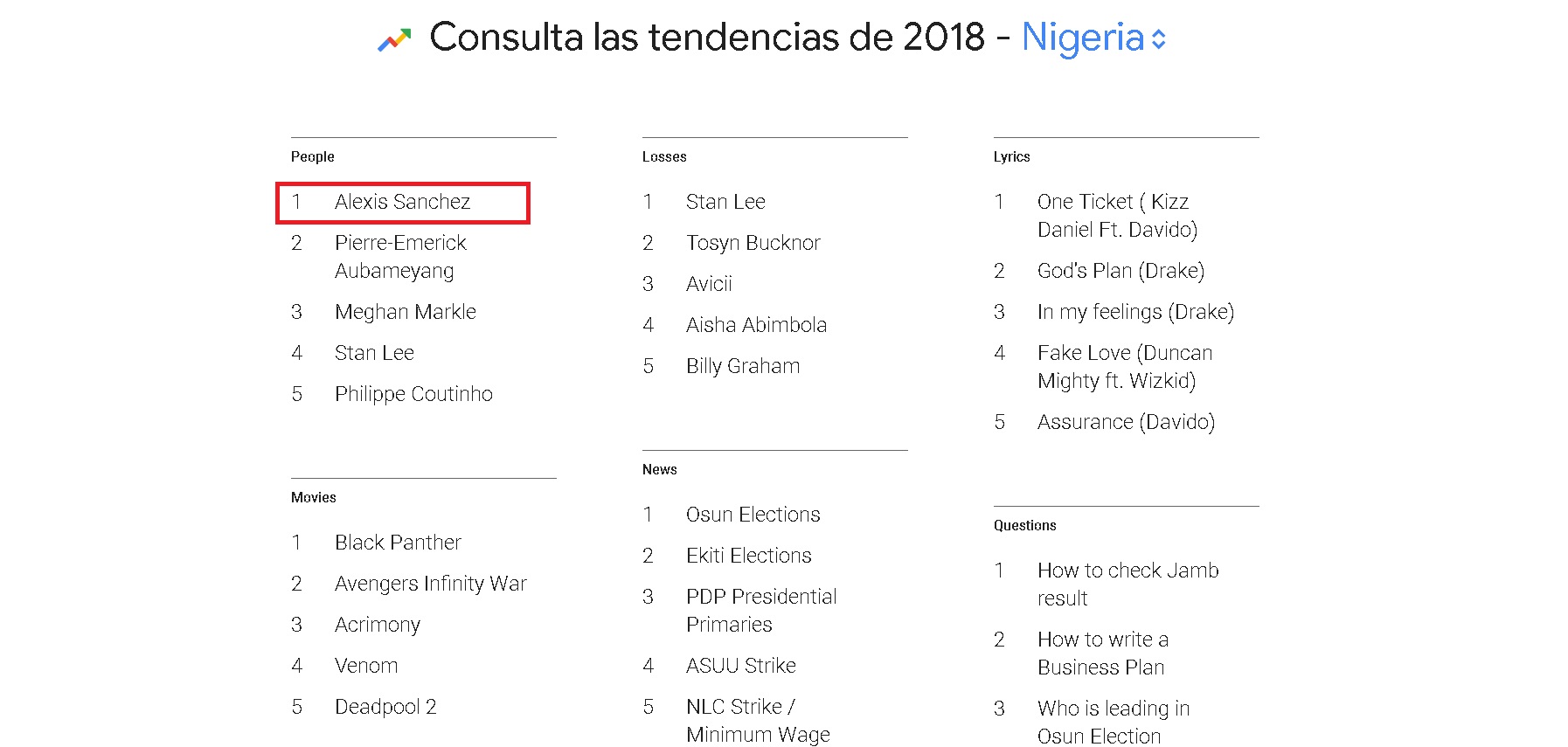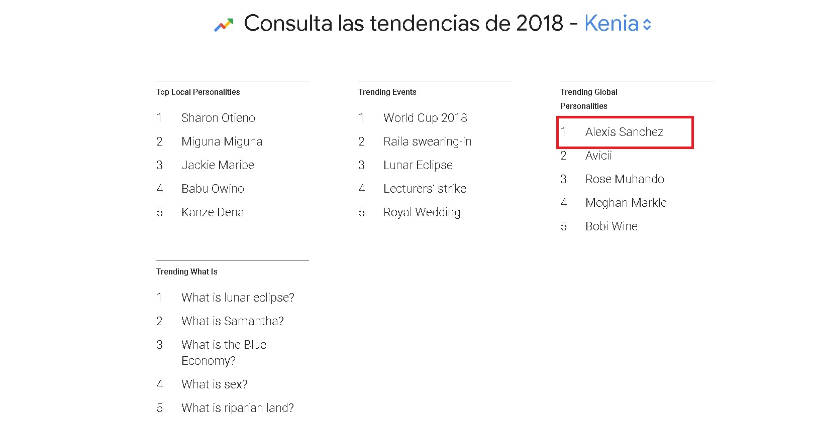 Para sorpresa de nosotros, los chilenos, nada más y nada menos que en dos países de África el atacante nacido en Tocopilla y que defiende los colores del Manchester United, Alexis Sánchez, es uno de los nombres más buscados a lo largo de este año nada más y nada menos que en Kenia y Nigeria.