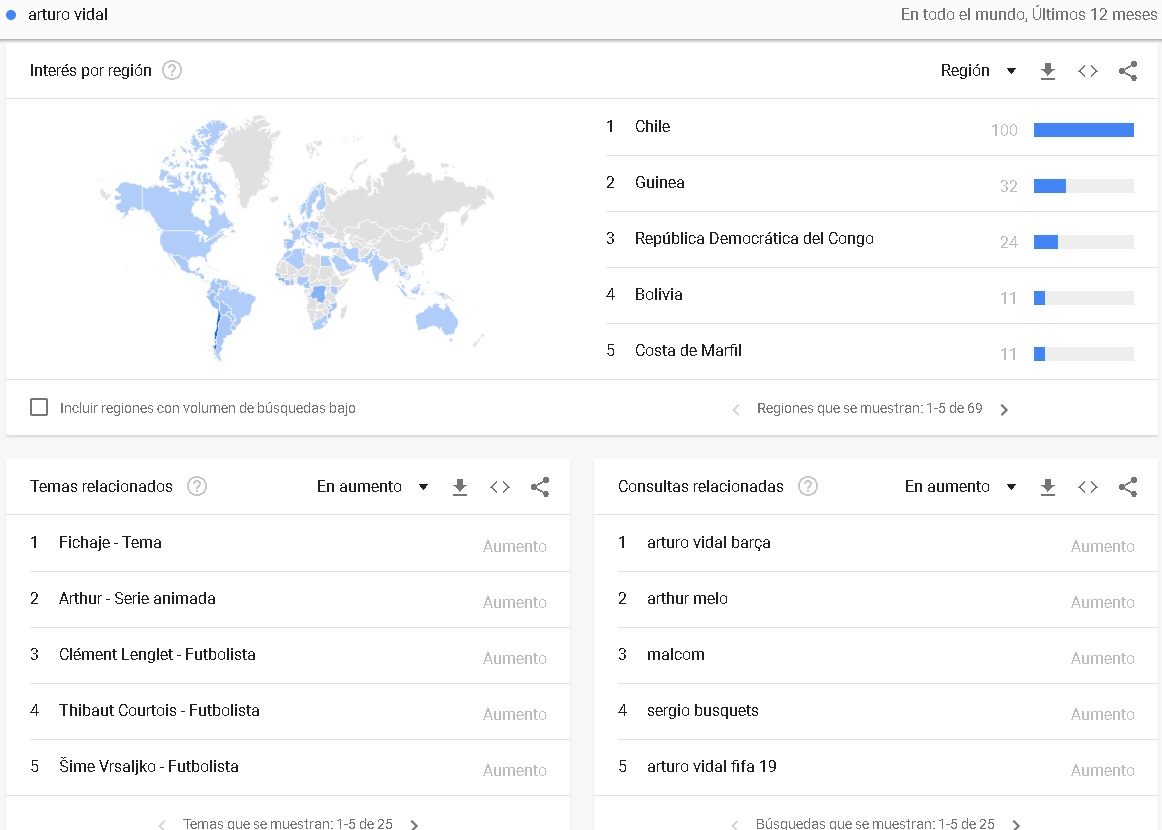 El otro compatriota que es mundialmente conocido por su talento para el fútbol, es el volante que defiende los colores del Barcelona, Arturo Vidal. El King no se queda atrás y es uno de los nombres más googleados por los usuarios de Guinea, República del Congo y Costa de Marfil.