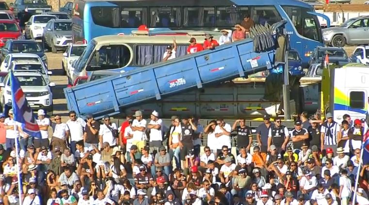 Aprovechando las herramientas de las faenas mineras un grupo de hinchas se subió a la parte de la carga de un camión para poder ver el partido entre Cobresal vs Colo Colo por la cuarta fecha del Torneo Nacional.