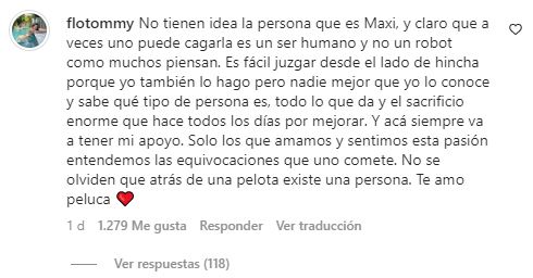 A través de un comentario en un post del sitio Sentimiento Popular, la joven uruguaya señaló que "no tienen idea la persona que es Maxi. Claro que a veces uno puede cagarla,